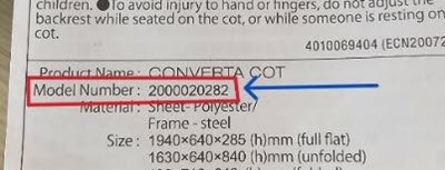 First, locate the sewn-in label on the bottom of the cot's fabric as shown in the example below.